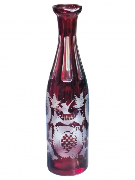 • CRISTAL DOUBLE, uma (1) licoreira sem tampa confeccionada em cristal double na tonalidade vermelha, lapidada por caneluras, elementos vegetalistas, animais e casarios em baixo relevo, apresenta bicado na borda, medindo 28cm de altura.