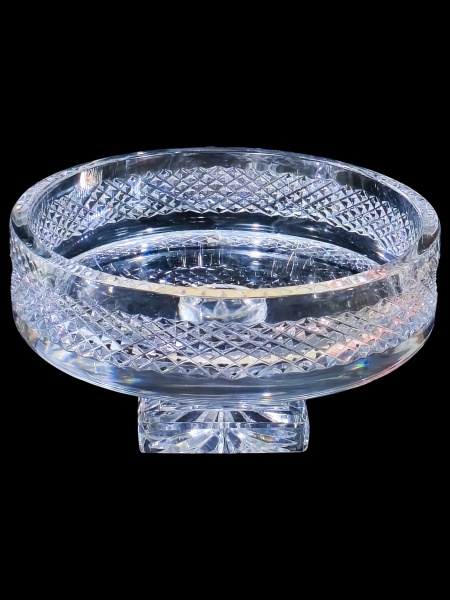 • CRISTAL, uma (1) fruteira de pé confeccionada em cristal translucido com espessa faixa lapidada em bico de jaca, haste facetada, apoiada sobre base quadrangular com fundo estrelado, medindo 11x20cm.