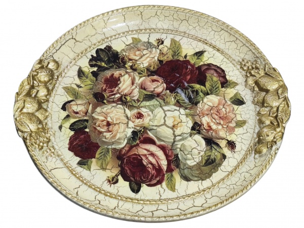 • DIVERSOS, uma (1) bandeja redonda confeccionada em madeira com patina creme com craquele em vasta douração, decorado por flores e folhagens em policromia e alças no feitio de frutos com pintura dourada, marcado TIRANNANZE, origem italiana, medindo 21x20cm.