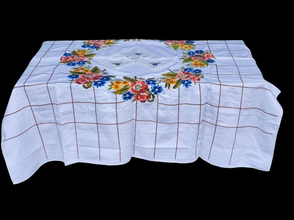 • CAMA, MESA & BANHO, conjunto composto por uma (1) toalha de mesa em tecido branco e três (3) guardanapos, apresentando bordados florais policromados dispostos em guirlanda central, além de padronagem quadriculada bordada ao longo do campo da peça, toalha medindo 150x150cm e guardanapos 25,5x25,5cm.