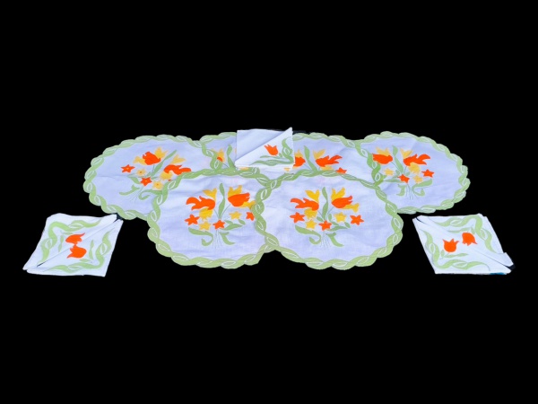 • CAMA, MESA & BANHO, jogo americano composto por seis (6) peças e cinco (5) guardanapos, confeccionados em tecido branco, decorados com bordados florais policromados em tons de laranja, amarelo e verde, apresentando borda festonada na tonalidade verde, formando moldura decorativa, jogo 38cm e guardanapos 34x34cm.