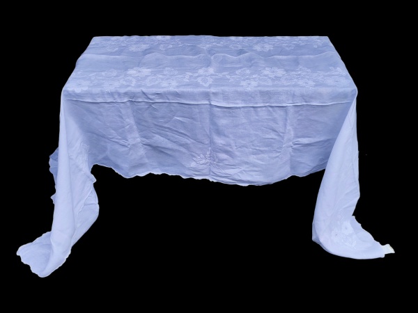 • CAMA, MESA & BANHO, uma (1) toalha de mesa quadrada confeccionada em tecido branco com bordados manuais em relevo, apresentando motivos florais estilizados distribuídos pelo campo da peça, medindo 150x150cm.