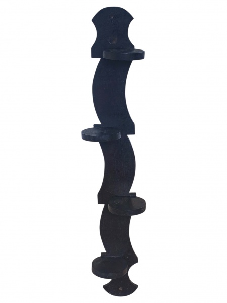 • MOBILIARIO, uma (1) prateleira de parede vertical, confeccionada em madeira escura, com estrutura recortada em linhas curvas e quatro (4) pequenos apoios circulares distribuídos ao longo do eixo, próprios para acomodar objetos decorativos, pequenas esculturas, vasos ou colecionáveis, medindo 91x15x11cm.