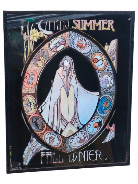 • QUADRO, um (1) quadro  com fundo espelhado, apresentando composição simbólica com figura feminina central e medalhões do zodíaco distribuídos em aro ornamental, acompanhados das inscrições Summer e Fall / Winter. A obra exibe estética Art Nouveau, com traços estilizados, paleta contrastante e elementos gráficos decorativos, moldura em metal com sinais de oxidação, medindo 51x41cm;