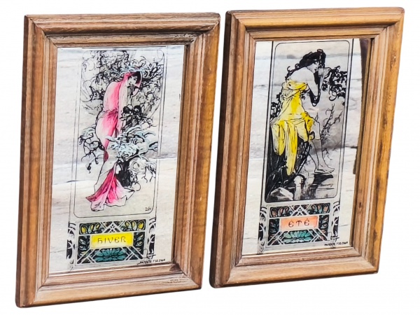 • QUADROS, dois (2) quadros com fundo em espelhado apresentando composições de estética Art Nouveau, com figuras femininas estilizadas representando as estações Hiver (Inverno) e Été (Verão). As imagens, inspiradas em ilustrações clássicas do início do século XX, são aplicadas sobre fundo espelhado, proporcionando profundidade visual e efeito decorativo diferenciado. Peças emolduradas em madeira, medindo 31x21cm;