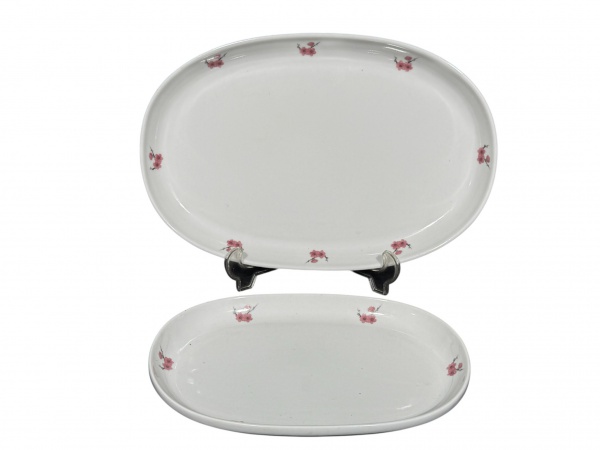 • PORCELANA BEATRIZ, duas (2) travessas ovais confeccionadas em porcelana na tonalidade branca com pintura de flores em monocromia, maior medindo 29.5x19,5cm e menor 23,5x15,5cm.