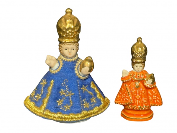 • ARTE SACRA, dois (2) imaginários confeccionados em faiança vitrificada representando Menino Jesus de Praga, ambos esmaltados em policromia com realces em ouro, maior medindo 8,5cm e menor 6cm.
