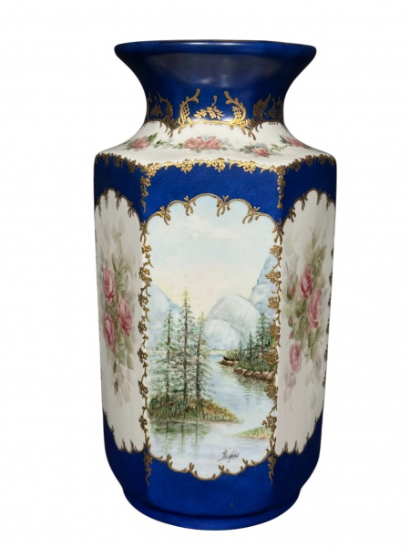• PORCELANA SÃO CAETANO, um (1) vaso sextavado confeccionado em porcelana nacional na tonalidade branca, espessas faixas na tonalidade azul escuro, pintura de paisagens, guirlandas e elementos florais em policromia com guirlanda vegetalistas em vasta douração, medindo 35x14,5cm.