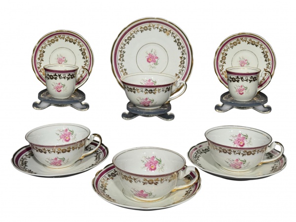 • PORCELANA REAL, seis (6) xícaras, sendo 4 para chá e 2 para café com seus respectivos pires, confeccionados em porcelana nacional na tonalidade branca, decorado por faixa na tonalidade vinho, pintura de flores e folhagens em policromia e guirlanda floral em vasta douração com filetes e arremates em ouro, todas para chá possuem ínfimos bicados, medindo 5x11x9,5cm e café 5x7,5x5,5cm.