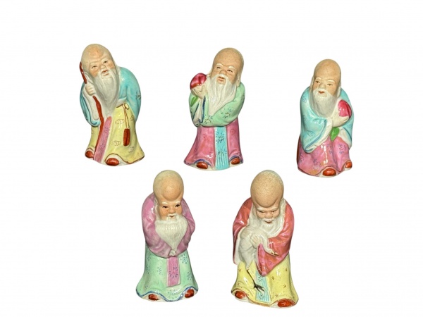 • ESCULTURAS ORIENTAIS, cinco (5) pequenas esculturas em porcelana esmaltada, representando anciãos orientais, com longas barbas, expressões serenas e vestimentas tradicionais, policromadas em tons suaves de verde, rosa, azul, amarelo e vermelho, medindo 8cm de altura.