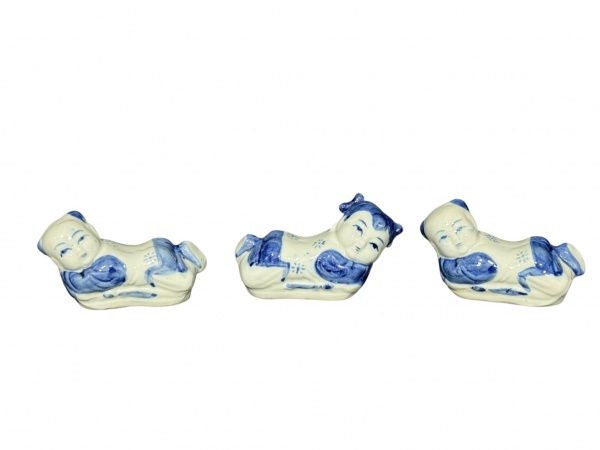 • PORCELANA ORIENTAL, três (3) descansos para talheres, representando 2 meninos e 1 menina, ornamentação pintada a mão na técnica blue and white, sem marca de manufatura aparente, medindo em media 8 cm comprimento.