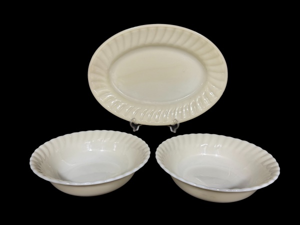 • COLOREX (Em 1961, a Vidraria Santa Marina lançou um conjunto de louças), três (3) peças confeccionadas em vidro na tonalidade creme, sendo: A) 2 saladeiras, medindo 6x24cm, e B) 1 travessa oval, medindo 36x25cm, bicada na borda.