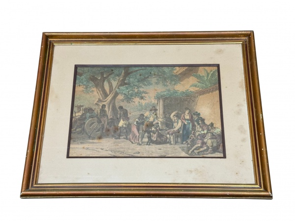 • QUADRO, uma (1) gravura colorida, representando cena de época com personagens em ambiente rural, incluindo figuras humanas em interação social sob árvores e junto a edificação, em composição de caráter histórico. Apresenta moldura em madeira com acabamento em tom esverdeado, frente em vidro, marcas do tempo interna, medindo 37x47cm.
