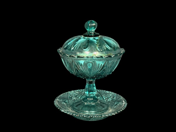 • VIDRO, uma (1) compoteira com seu respectivo presentoir do início do século XX executada em vidro prensado, tonalidade azul, moldada no padrão dito "lágrima", bojo hemisférico de borda recortada em arcos, tampa abaulada encimada por puxador com feitio de fruto, apoiada sobre fuste campaniforme. Possui bicados na borda e tampa colada. Med.: 23 x 16,5 cm