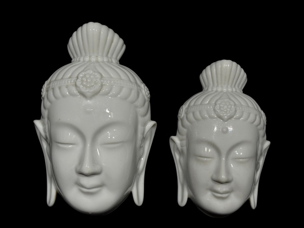 • PORCELANAS, duas (2) esculturas decorativas de parede em porcelana branca, representando faces de divindade oriental (Buda), com expressão serena, olhos semicerrados, orelhas alongadas e adorno floral frontal, acabamento esmaltado brilhante, maior medindo 16x9cm e menor 13x8cm.