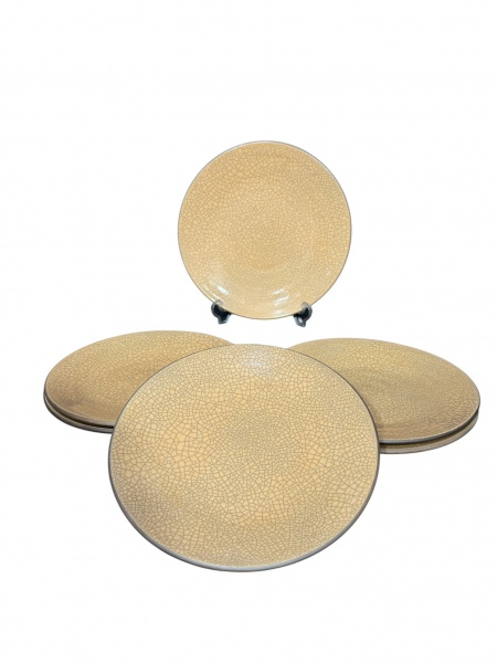 • CERÂMICAS, seis (6) pratos rasos confeccionados em cerâmica vitrificada na tonalidade marrom com decoração craquelada, medindo 25cm de diâmetro.