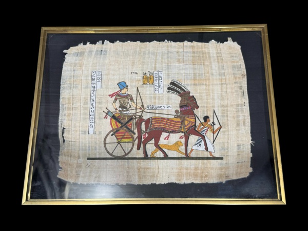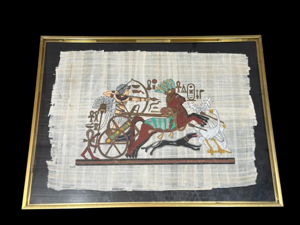 • QUADRO, uma (1) reprodução em papiro, representando cena de inspiração egípcia, com figura em carruagem puxada por cavalos, acompanhada de elementos simbólicos e escrita hieroglífica, moldura em metal dourado com proteção em vidro, medindo 42,5x55cm.