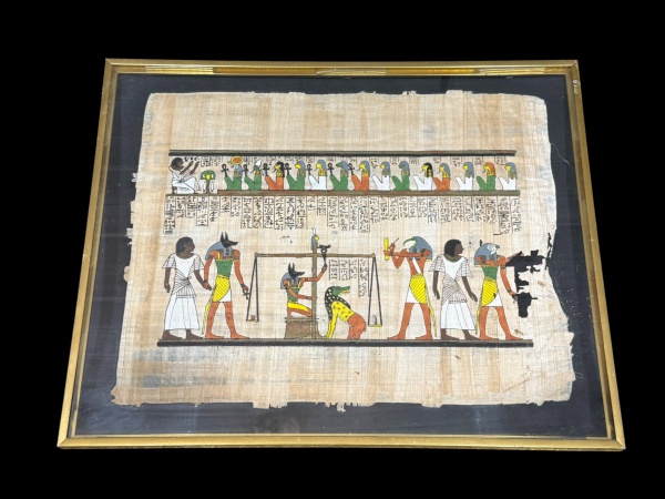• QUADRO, uma (1) reprodução em papiro, representando cena de inspiração egípcia, com figuras humanas e divindades zoomórficas em composição ritualística, acompanhadas de escrita hieroglífica, moldura em metal dourado com proteção em vidro, medindo 42x52,5cm. Desgastes no papiro.
