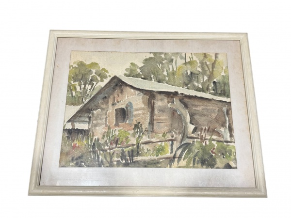 • QUADRO, uma (1) pintura em técnica de aquarela, representando paisagem rural com construção simples em meio à vegetação, moldura em madeira com patina branca e frente em vidro, medindo  38x47,5cm e pintura 27x36,5cm.
