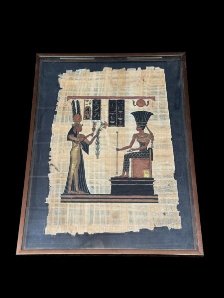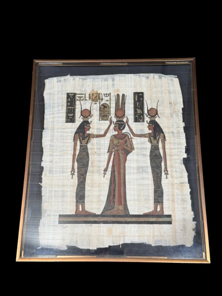 • QUADRO, uma (1) reprodução em papiro, representando cena de inspiração egípcia, com figuras femininas em posição frontal, portando símbolos tradicionais, acompanhadas de escrita hieroglífica, moldura em metal de tom escuro com proteção em vidro, medindo 49,5x41cm.