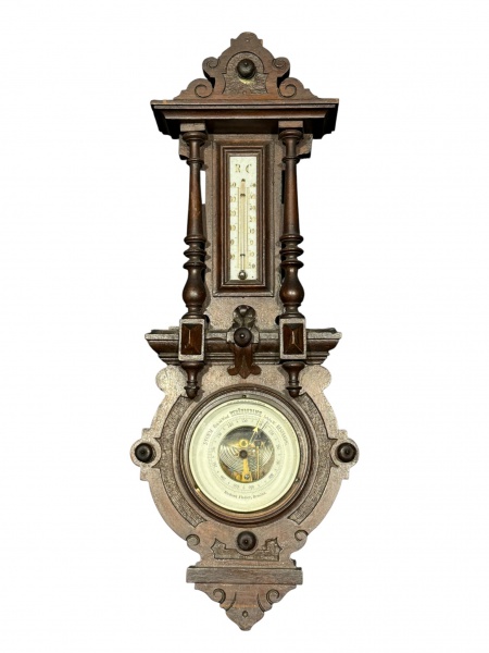 • RELÓGIO, um (1) barômetro com termômetro RICHARD FIEDLER confeccionado em madeira entalhada no feitio de relógio, com colunas torneadas, entalhes vegetalistas, recortes na borda e aplicação de bilros (1 possui sinal de cola), medindo 51x20cm.