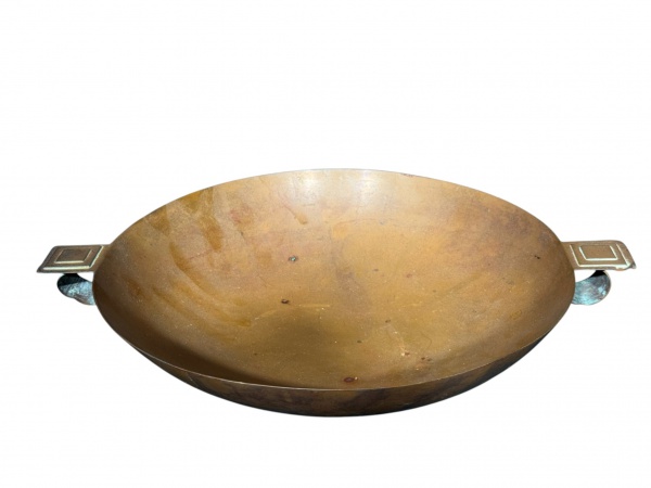 • COBRE, uma (1) fruteira confeccionada em cobre, alças laterais em argolas com cinzelado escalonado, corpo liso, apoiado sobre base circular, medindo 7x32,5x26cm, leve mossa na alça.