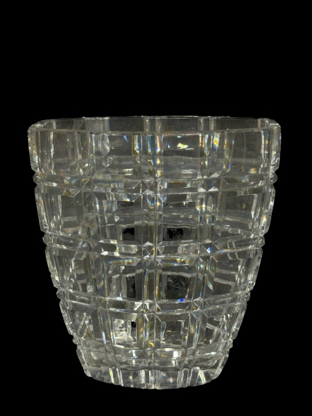 • CRISTAL, um (1) vaso confeccionado em cristal translucido com lapidação quadriculada em baixo relevo, apresenta bicados na borda e na base, medindo 23x20x11cm.