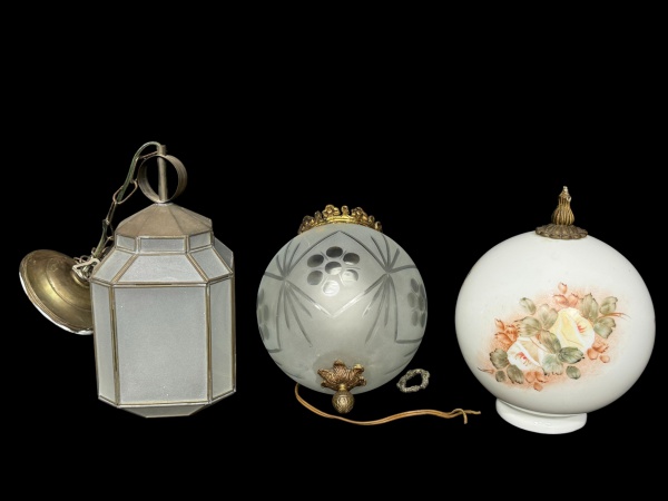 • VIDROS e LUMINÁRIA, conjunto com três (3) peças, sendo: A) uma (1) lanterna/luminária pendente em metal e vidro fosco, de formato facetado, medindo 30cm de altura; B) um (1) lustre para uma lâmpada, armação em bronze, cúpula esférica em vidro fosco gravado, lapidada por palmas e flores em baixo relevo, fiação no estado, medindo 27x20cm e C) uma (1) globo confeccionado em vidro opalino, decorada com motivos florais policromados, com acabamento inferior em bronze, medindo 26x9,5cm, bicado no bocal.