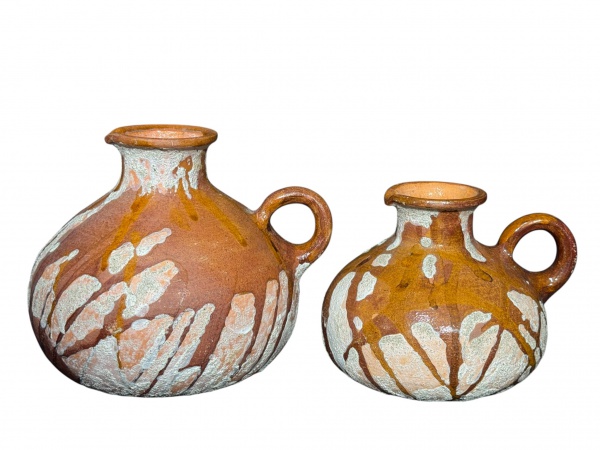 • CERÂMICAS, duas (2) jarras confeccionadas em cerâmica na tonalidade marrom, decoração abstrata em tom de cimento, maior medindo 20x25x9cm e menor 16x20x8cm.
