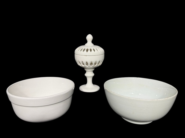 • FAIANÇAS, lote com três (3) peças confeccionadas em faiança vitrificada na tonalidade branca, sendo: A) 1 porta velas no feitio de compoteira, bojo e tampa em vazados, moldado por perolados e haste cilíndrica, bicado na borda e fio de cabelo na tampa, medindo 26x13,5cm e B) 2 tigelas, 1 apresenta bicado e 1 com craquele, medindo 12x25cm e 11x24cm.