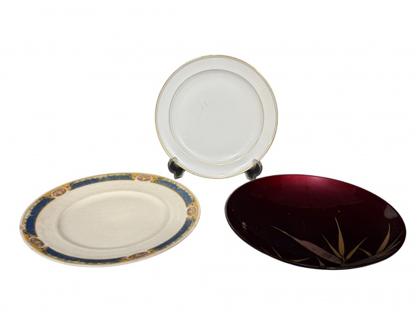 • DIVERSOS, três (3) pratos decorativos de modelos, tamanhos, decorações e materiais distintos, sendo 1 em plástico na tonalidade vermelho/preto decorado por folhagens douradas, medindo 21,5cm, B) 1 LIMOGES, decorado por filetes em ouro, medindo 19,5cm e C) 1 WH. GRINDLEY, decorado por elementos florais e vegetalistas em policromia, sinais de craquele, medindo 23cm, bicado na borda.