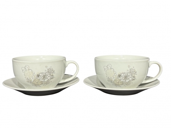 • PORCELANA WINCY, par (2) de xícaras para chá com seus respectivos pires confeccionadas em porcelana na tonalidade branca, decorada por motivos florais em filetes prateados, medindo 5,5x12x10cm.