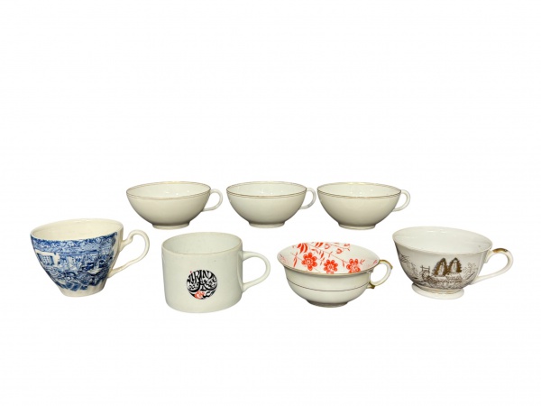 • PORCELANAS e FAIANÇAS, lote com sete (7) xícaras de coleção para chá sem pires confeccionados em porcelana/faiança de modelos, tamanhos e decorações distintas, 1 apresenta bicado, maior medindo 7x12x9,5cm e menor 4,5x11,5x9,5cm.