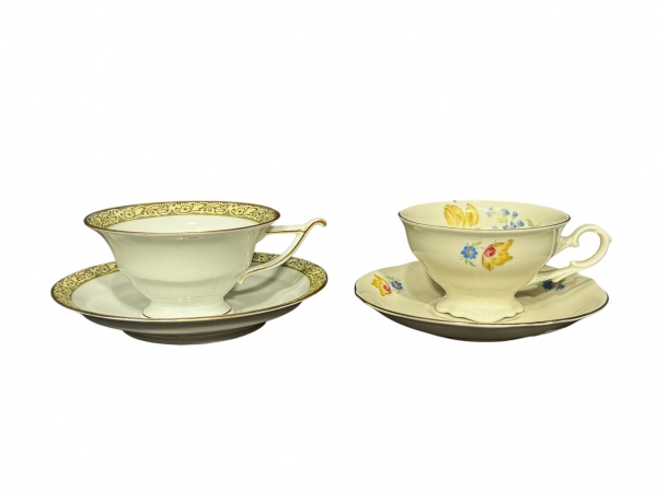 • PORCELANAS, duas (2) xícaras de coleção para chá com sus respectivos pires confeccionadas em porcelana europeia, sendo: A) HERTEL JACOB, uma com guirlanda floral em monocromia com borda filetada a ouro, medindo 5,5x12,5x10cm e B) KOENIGSZELT, uma na tonalidade creme, decorada por flores e folhagens em policromia e borda filetada em ouro, medindo 5x11,5x9cm.