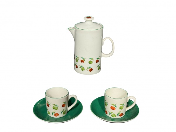 • PORCELANAS, três (3) peças, sendo: A) 1 bule para cafézinho, medindo 11x9x6cm e B) 1 par de xícaras para cafézinho com seus respectivos pires, medindo 4x5,5x4cm, confeccionados em porcelana na tonalidade branca com pintura de maças e folhagens em policromia com borda filetada na tonalidade verde.