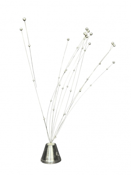 • OBJETO DECORATIVO, um (1) arranjo de mesa original dos anos 70 com 14 hastes de aço e esferas prateadas, medindo 47cm de altura. Apresenta falhas na prateação da base e leves mossas.