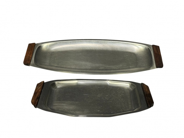 • METAL PRATEADO INOX, duas (2) bandejas confeccionadas em aço inox com alças em madeira, ambos possuem mossas e sinais de uso, medindo 40x15cm e 28x15cm.