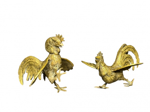 • ESCULTURAS, duas (2) esculturas confeccioandas em bronze representando galos de rinha, medindo 10x14x14cm e 13x13x12cm.
