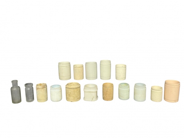 • COLECIONISMO, dezesseis (16) frascos de farmácia sem tampa de modelos, tamanhos, decorações e materiais distintos, alguns apresentam bicados, maior medindo 7x4cm e menor 5x4cm.