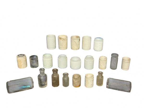 • COLECIONISMO, vinte e dois (22) frascos de farmácia sem tampa de modelos, tamanhos, decorações e materiais distintos, alguns apresentam bicados, maior medindo 8,5x4cm e menor 4,5cm.