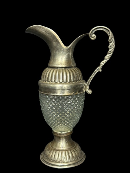 • METAL PRATEADO e VIDRO, uma (1) jarra confeccionada em vidro translucido com moldagem bico de jaca, gargalo e base confeccionado em metal espessurado a prata com cinzelado de caneluras, medindo 23cm de altura.