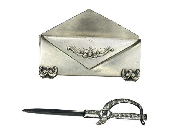 • METAL PRATEADO, lote com duas (2) peças confeccionadas em metal prateado, sendo: A) 1 porta cartas confeccionado em metal espessurado, aplique vegetalista em relevo, apoiada sobre 4 pés finalizados em volutas, medindo 11x15cm, leves mossas e B) 1 abridor de cartas no feitio de espada confeccionado em metal prateado com cinzelado vegetalista, medindo 18,5cm.