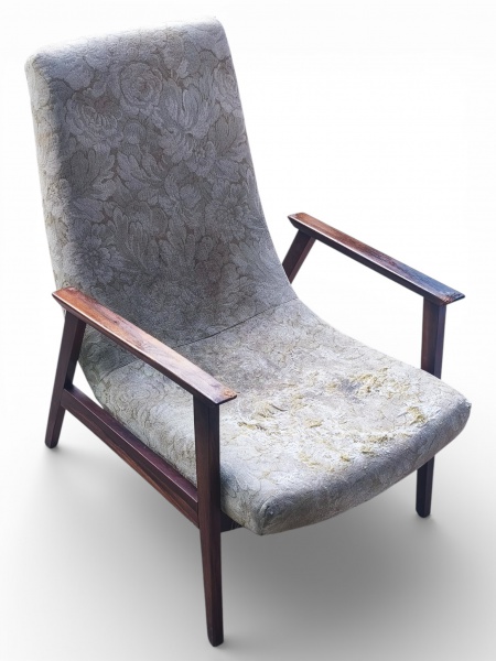 • Casa Gelli Móveis SA (Petrópolis, RJ, 23 de maio de 1887 - Petrópolis, RJ, 2019), uma (1) poltrona GELLI, década de 60 confeccionada em madeira nobre com assento e encosto forrado em tecido desgastado (necessitando troca), leves quebras na madeira vide foto, marcas do tempo, medindo 84x61x80cm.