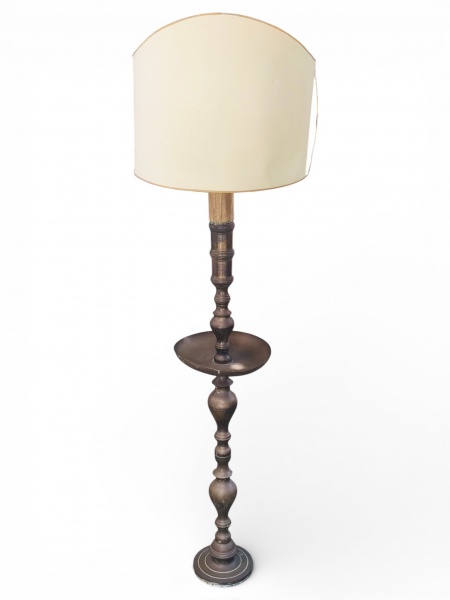 • LUMINÁRIA, uma (1) luminária de piso confeccionada em metal dourado, estilo francesa, corpo ricamente torneado em segmentos sucessivos, base circular e prateleira intermediária (leve mossa) integrada, funcional e decorativa, cúpula em pergaminho com dano na borda, vide foto, medindo 120cm de altura sem a cúpula.