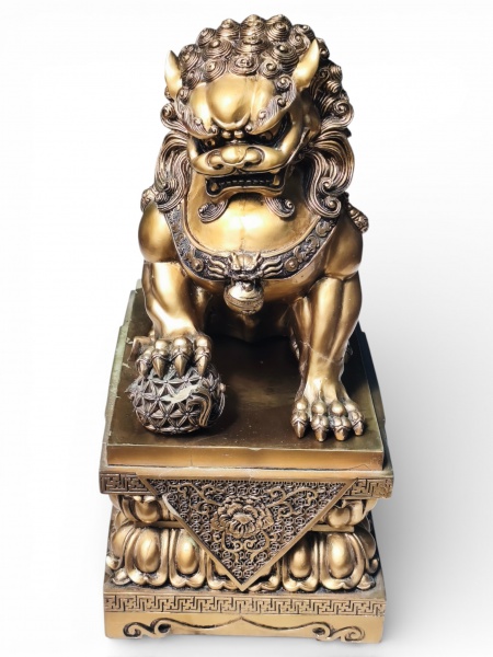 • ESCULTURA, uma (1) escultura representando Cão Fu (Leão Guardião), executada em resina, com acabamento em tom dourado, assentada sobre base integrada também em resina, ricamente trabalhada com elementos geométricos, florais e simbólicos em relevo, apresenta o tradicional Cão Fu com uma das patas apoiada sobre esfera, símbolo de proteção, poder, prosperidade e equilíbrio, muito utilizada em ambientes orientais, comerciais ou decorativos, apresenta quebra na bola, colado na mão e rachadura na base, medindo 35x31x25,5cm.