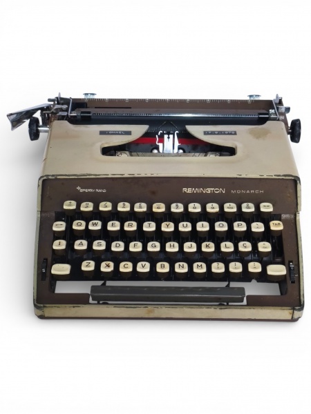 • DIVERSOS, uma (1) máquina de escrever antiga, Remington, modelo Monarch, fabricada pela Sperry Rand, gabinete metálico com acabamento em tons bege e marrom, teclado QWERTY com teclas plásticas, carro com régua graduada e comandos mecânicos manuais, marcas de uso e sinais de oxidações, medindo 16.x34x35,5cm, acompanha caixa com desgastes.