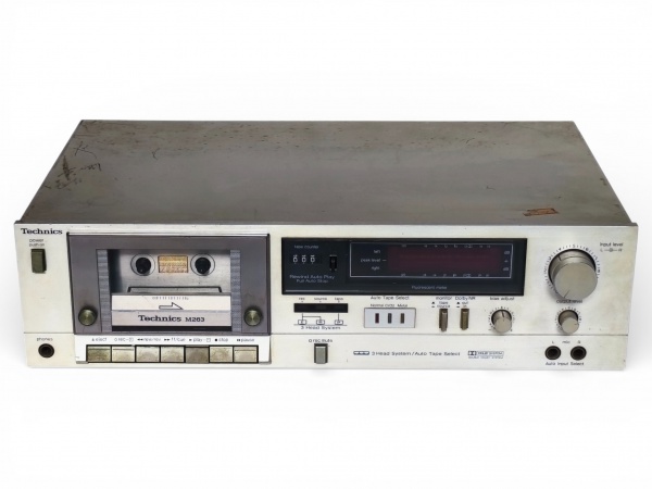 • SOM, um (1) deck de fita cassete da marca Technics, modelo M263, gabinete metálico com painel frontal em acabamento claro, sistema 3 Head, seleção automática de tipo de fita (Normal / CrO / Metal), Auto Tape Select, medidores de nível fluorescentes, controles manuais frontais e entrada para microfone e fones de ouvido, não testado e sem garantia de funcionamento, vendido no estado da foto, medindo 11,5x43x26cm.