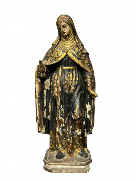 • ARTE SACRA. Século XIX, uma (1) imaginária confeccionada em madeira entalhada a mão representando Santa Rita de Cássia, patina em tom azul com realces florais em ouro, olhos em vidro, apresentando quebra em ambas mãos, vide foto, falhas na patina, vendida no estado da foto, medindo 28cm de altura.