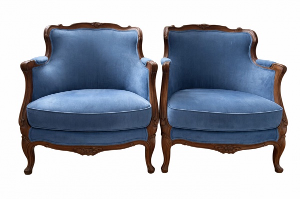 • MOBILIARIO, par (2) de poltronas em estilo clássico, confeccionadas em madeira nobre, com estrutura em madeira nobre entalhada por elementos vegetalistas e recortes na borda e estofamento revestido em tecido aveludado na tonalidade azul, medindo 84x84x65cm.