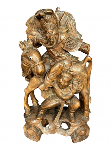 • ESCULTURA ORIENTAL, uma (1) escultura confeccionada em madeira entalhada a mão representando figura guerreira em cena dinâmica, acompanhada de cavalo e personagem secundário, ricamente trabalhada em alto-relevo e vazados, medindo 33x18cm.